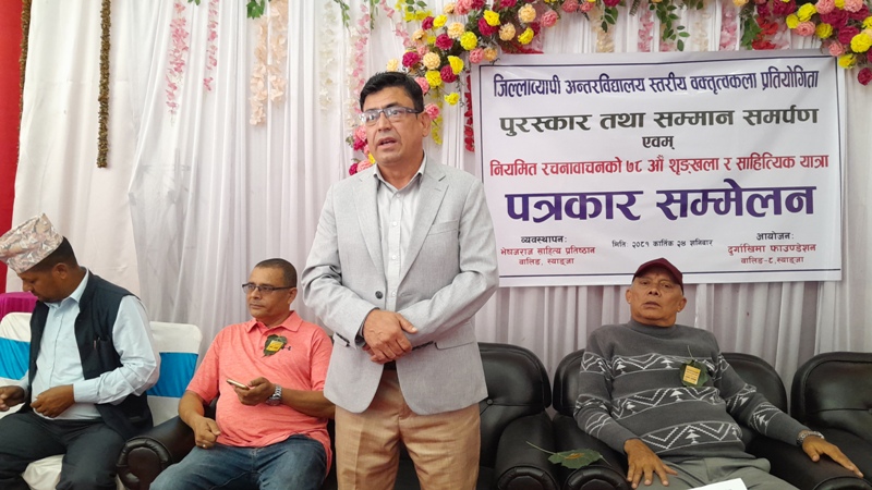 दुर्गाखिमा फाउण्डेशनले “बढ्दो वैदेशिक आकर्षण, कारण र समाधान” विषयक जिल्लास्तरीय वक्तृत्वकला प्रतियोगिताको आयोजना गर्ने भएको हो । भेषजराज साहित्य प्रतिष्ठानको व्यवस्थापनमा २६ गते सोमबार वालिङमा जिल्लास्तरीय वक्तृत्वकला प्रतियोगिता हुने शनिबार पत्रकार सम्मेलन गरी जानकारी दिइएको हो ।