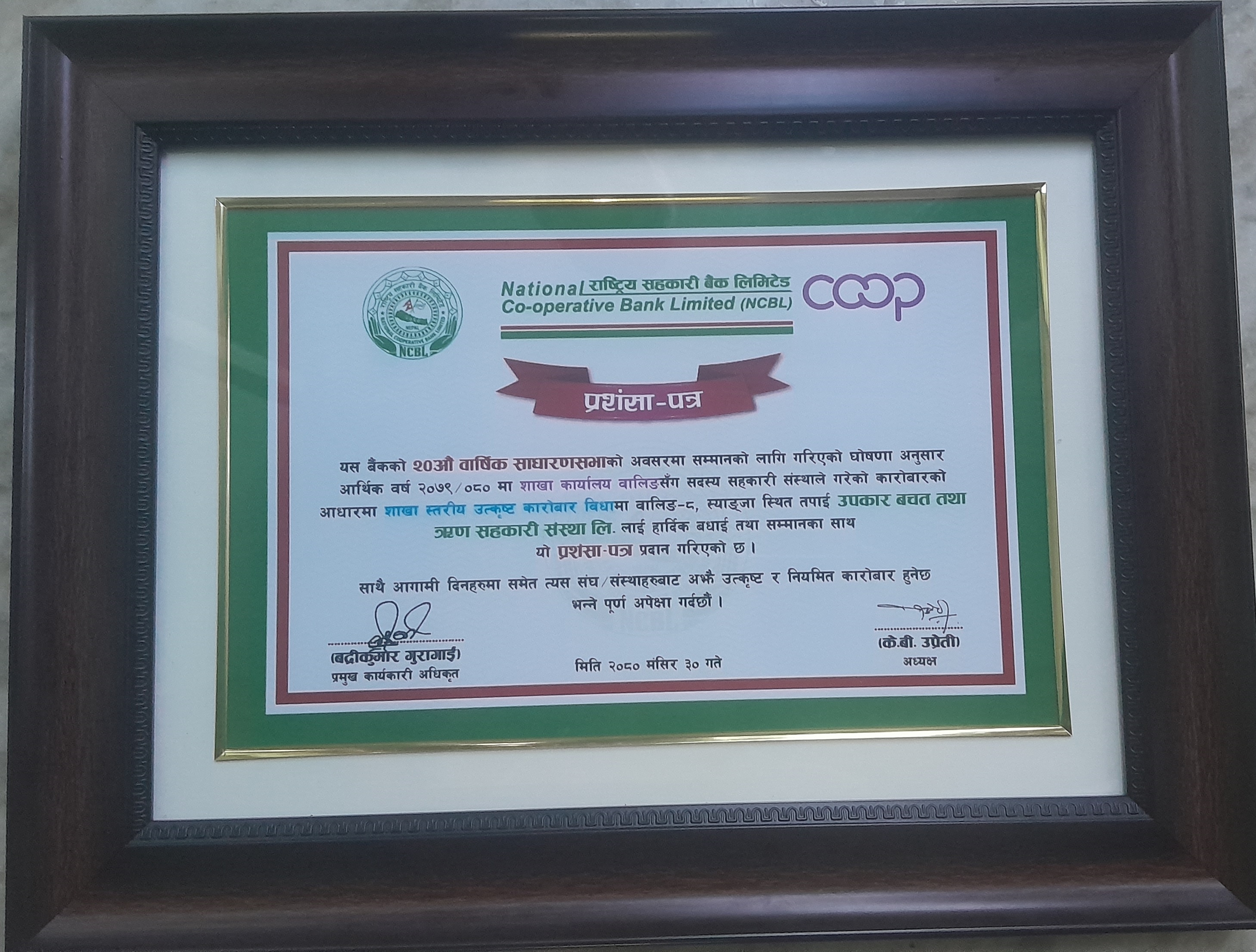 राष्ट्रिय सहकारी बैंकको २०औँ वार्षिक साधारणसभाको अवसरमा आयोजित सहकारीको वर्तमान अवस्था र भावी कार्यदिशा विषयक प्रदेशस्तरीय गोष्ठी तथा सदस्य सम्मान कार्यक्रममा वालिङका उपकार बचत तथा ऋण सहकारी संस्था लिमिटेड र महालक्ष्मी बहुउद्देश्यीय सहकारी संस्था लिमिटेड सम्मानित एवम् प्रशंसित