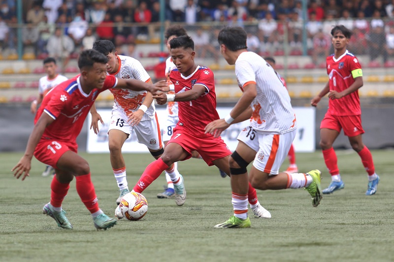 लतिपुरको सातदोबाटोमा रहेको एन्फा कम्प्लेक्सको मैदानमा आज भएको पहिलो सेमिफाइनलमा नेपालले भुटानलाई पेनाल्टी शुटआउटमा ४–१ ले हरायो ।
