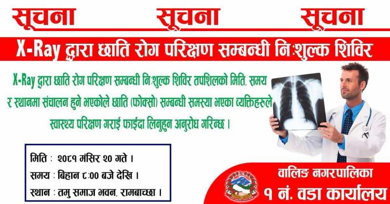 निःशुल्क स्वास्थ्य शिविर यही मङ्सिर २० गते गरिने भएको हो । छातीरोग परीक्षणसम्बन्धी निःशुल्क स्वास्थ्य शिविर वडा नम्वर १ स्थित रामबाच्छामा गरिने