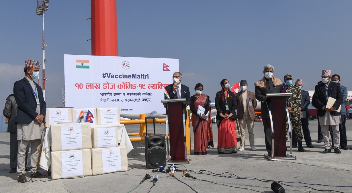 भारतले अनुदानमा उपलब्ध गराएको कोरोना भाइरसविरुद्धको खोप काठमाडौं आइपुगेको छ । भारतले उपलब्ध गराएको १० लाख डोज खोप एयर इन्डियाको विमानमार्फत आज नेपाल आइपुगेको हो